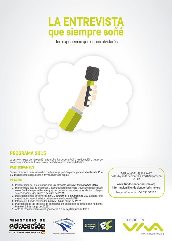 - Difusión de la lista de los grupos y escuelas participantes (a través de la Página Web fundaciónperiodismo.org y de cartas a los directores de los colegios seleccionados): Hasta el 10 de abril de 2015.