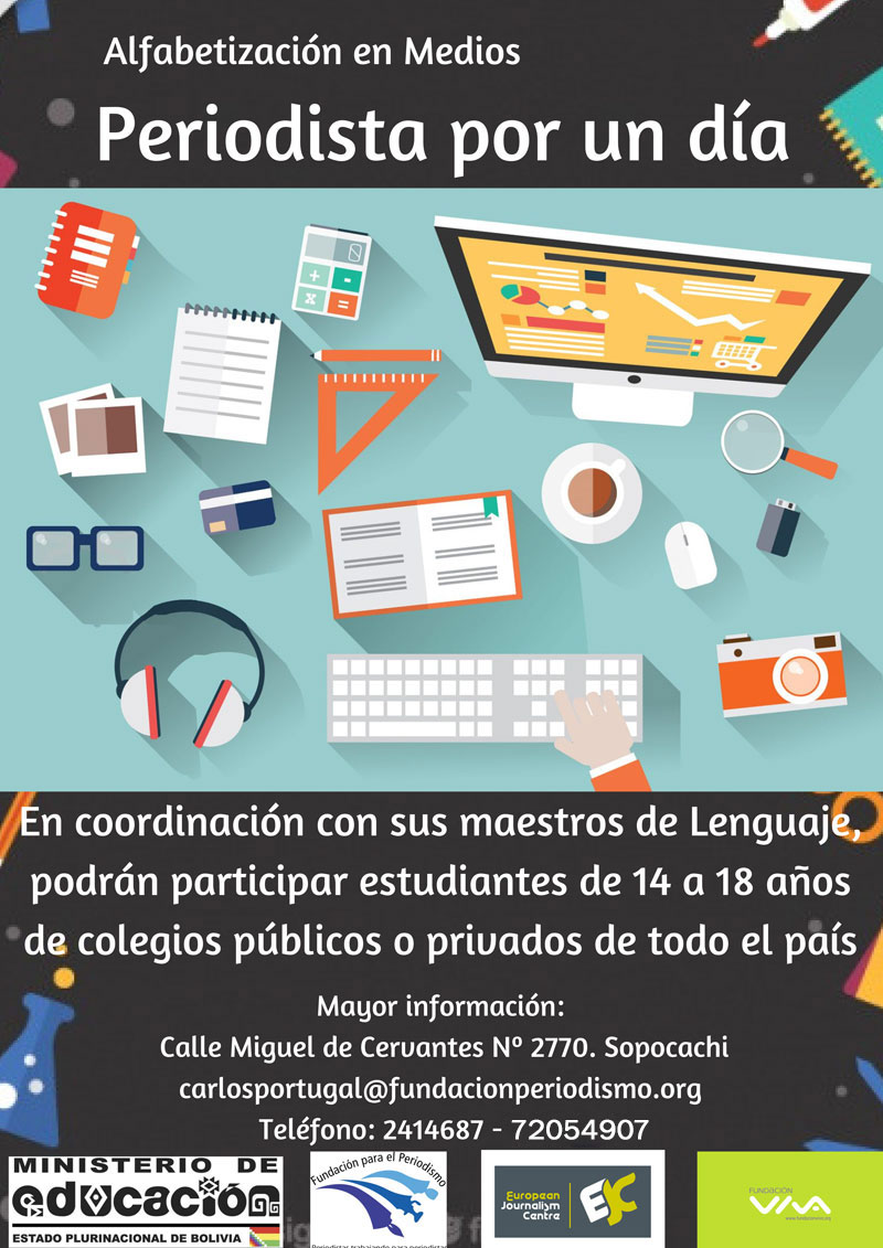 La FPP, con el apoyo del European Journalism Centre, del Observatorio La Paz Cómo Vamos, de la Fundación Viva y de los medios de comunicación de prensa escrita, convoca a los jóvenes estudiantes bolivianos, entre 14 y 18 años de edad, a realizar el trabajo de periodista durante toda una jornada. Producto de esta experiencia -que estará guiada por periodistas profesionales de cada medio-, los participantes deberán producir un reportaje o una crónica que será analizada por el jurado calificador.