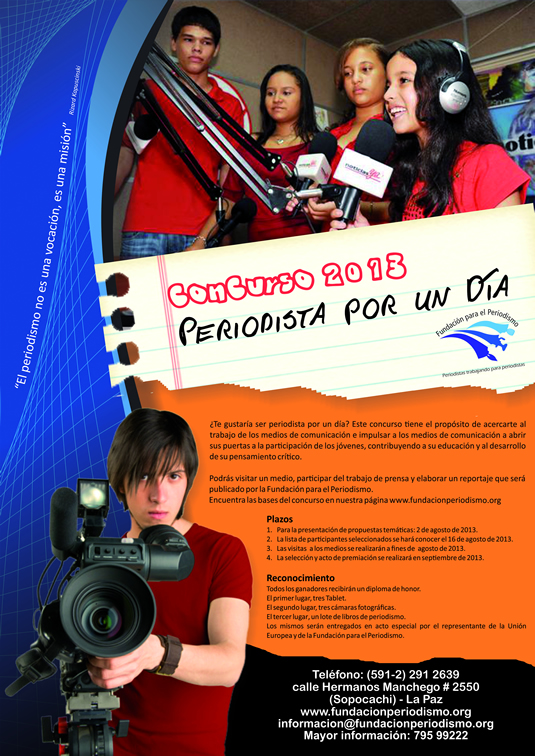 La FPP, en el marco de su programa “Alfabetización en medios”, que tiene el objetivo de introducir en la educación una nueva forma de leer y aprovechar los medios de comunicación para fortalecer la participación democrática, convoca a los estudiantes de 16 a 18 años (pre promo y promociones) de La Paz/El Alto, Santa Cruz, Cochabamba, Sucre y Tarija, que estén interesados en conocer y experimentar de cerca el trabajo periodístico, a participar del concurso “Periodista por un día”.