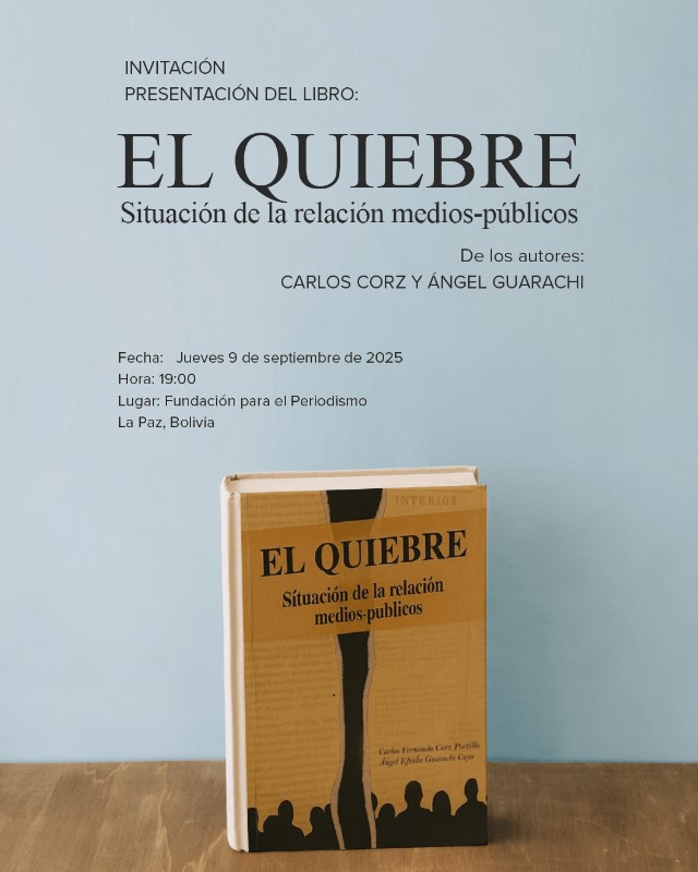 La Paz, 6 octubre de 2025. – La Fundación para el Periodismo invita a la presentación del libro “El Quiebre: Situación de la relación medios-públicos”, una obra escrita por los periodistas Carlos Corz y Ángel Guarachi, que aborda con mirada crítica y reflexiva las transformaciones en la comunicación boliviana contemporánea.