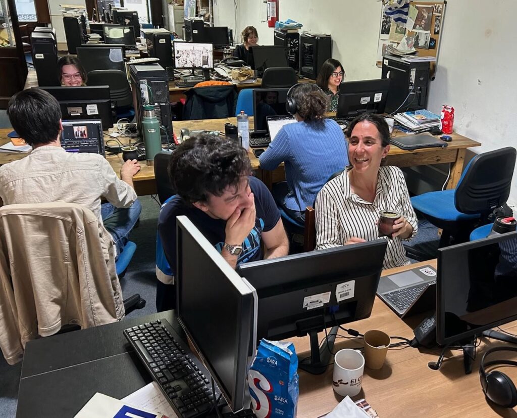 Natalia Uval, editora política y de opinión de la diaria, se ríe en la sala de redacción con un colega el 9 de octubre de 2025. Uval atribuye a la coalición de verificación de datos Verificado.uy, creada en 2019, el mérito de haber fortalecido los lazos entre los medios de comunicación uruguayos. (Foto: Sally Stapleton)