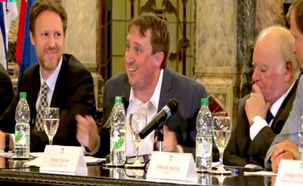 El presidente de la APU, Fabián Cardozo, en el centro, explica el impacto de contar con Enrique V. Iglesias, a la derecha, como fuerza de apoyo para la iniciativa del Pacto Ético durante la ceremonia de firma del pacto contra la desinformación en el Palacio Legislativo el 26 de abril de 2019. A la izquierda, Stefan Liller, representante del PNUD en Uruguay. (Foto del vídeo: De fogón en fogón)