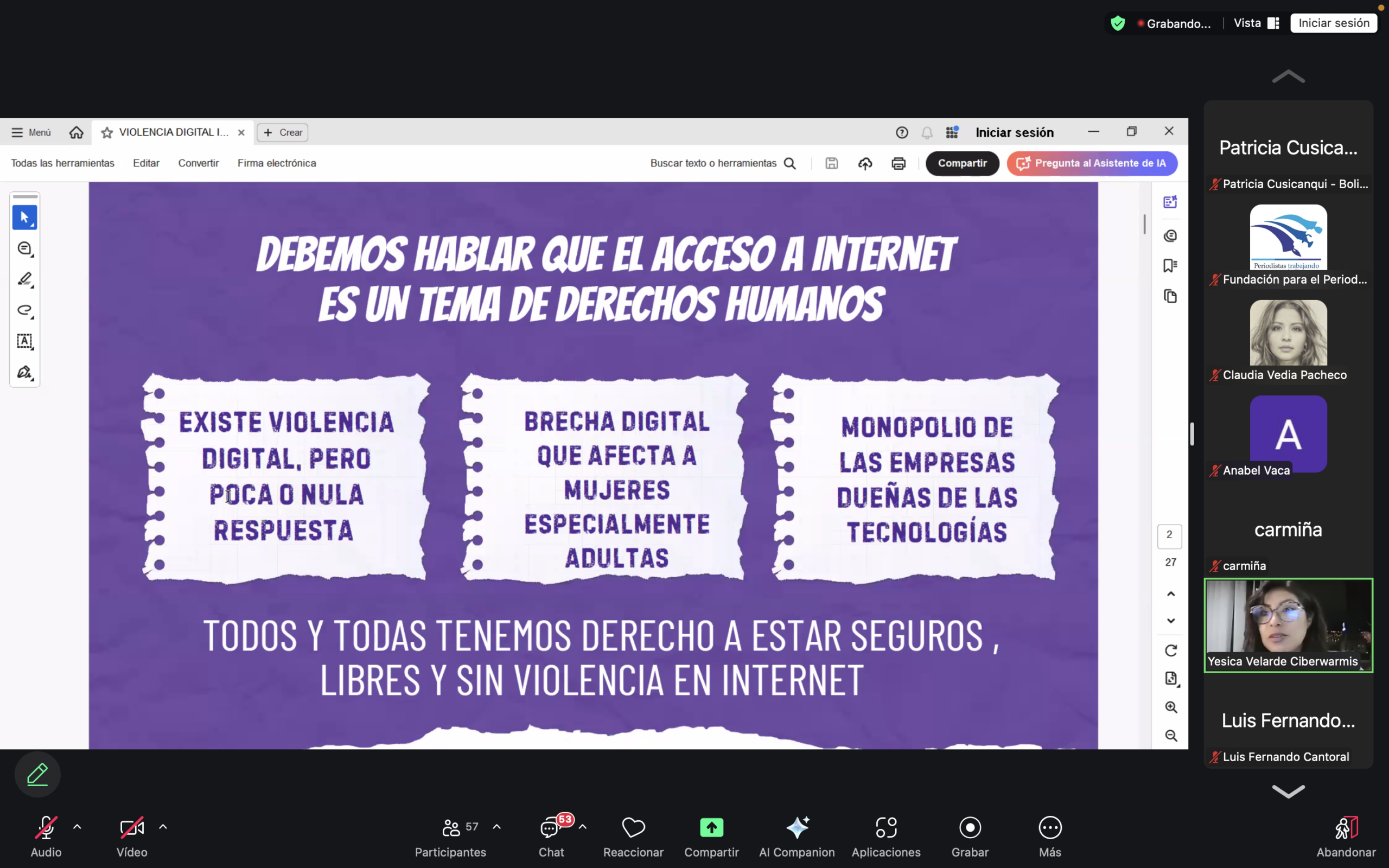 - Nuevas Amenazas: Se abordaron peligros digitales emergentes como el deepfake, el acoso en redes sociales y la importancia de la ciberseguridad para las mujeres en política.