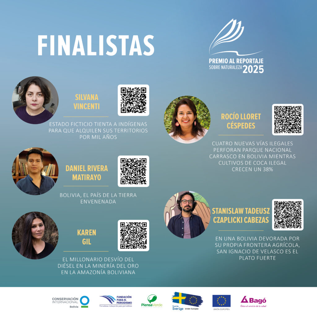 En un momento crítico para los ecosistemas de Bolivia, surgen héroes sin capa que se enfrentan al fuego para proteger los bosques, y también otros, quizás menos visibles, que alzan su voz con pluma, papel, micrófonos y cámaras en defensa de la naturaleza. El Premio al Reportaje sobre Naturaleza busca reconocer la valiosa labor de estos profesionales del periodismo y se enorgullece en presentar a los cinco reportajes finalistas de su edición 2025. Los ganadores serán anunciados el próximo 28 de agosto.