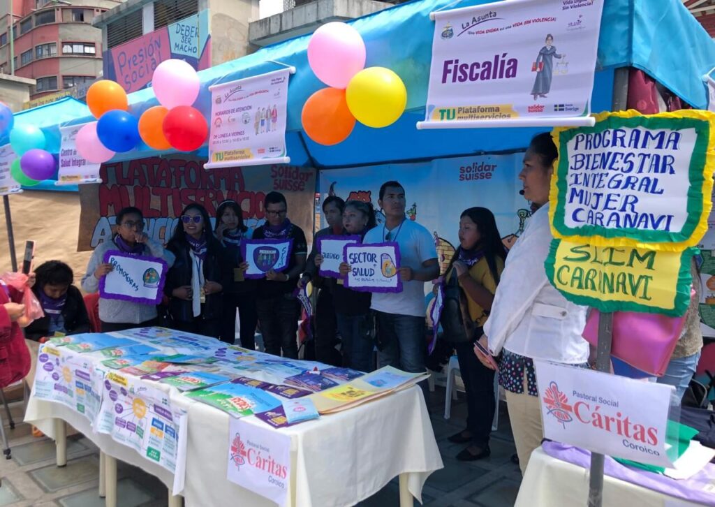 Cáritas es parte de la Plataforma Multiservicios de Atención Integral a Mujeres Víctimas de Violencia, en donde existe una ruta de atención, que involucra a promotoras comunitarias, los SLIMS, la FELCV (Fuerza Especial de Lucha Contra la Violencia), juzgados, el sector educativo y las organizaciones sociales, entre otros actores.