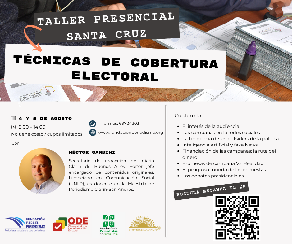 La Fundación para el Periodismo, la plataforma Bolivia Verifica, la Asociación de Periodistas de Santa Cruz y la Universidad NUR te invitan a postular al taller que buscan profundizar la comprensión y las habilidades de las y los periodistas en la cobertura de procesos electorales.