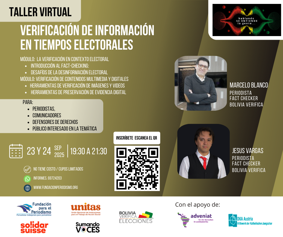 En el contexto de la era digital, la propagación de desinformación durante las elecciones es una amenaza directa a la democracia, moldeando la percepción pública y la toma de decisiones. Esta situación motiva la realización de un taller intensivo destinado a periodistas, comunicadores, defensores de derechos y al público en general para proporcionar herramientas necesarias para combatir la desinformación. En el marco del Proyecto «Hablando se entiende la gente» ejecutando por UNITAS en alianza con Solidar Suiza y la Fundación para el Periodismo con el apoyo de DKA AUSTRIA y ADVENIAT.