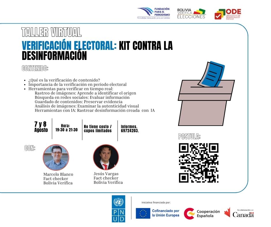 El taller es una iniciativa del Observatorio de Desinformación Electoral de Bolivia Verifica un proyecto impulsado por el Programa de las Naciones Unidas para el Desarrollo (PNUD). Te invitamos a participar de la capacitación diseñada para fortalecer las habilidades de las y los periodistas y contribuir a una ciudadanía más informada, promoviendo así un voto consciente e informado.