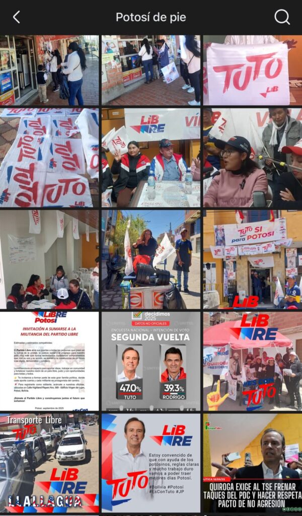 Finalmente, se puede observar que la página desinformante (Potosí de pie) publicó varios contenidos en apoyo a los candidatos de Alianza Libre en las Elecciones Generales 2025.