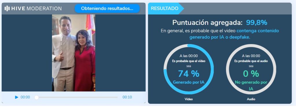 Por otra parte, se emplearon dos herramientas de análisis digital para conocer el grado de intervención artificial, y los resultados coinciden en ambos casos. Por ejemplo, Hive Moderation determinó que existe alta probabilidad de que el video haya sido generado con IA (74%).